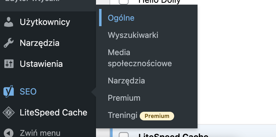 Po włączeniu wtyczki, w menu po lewej stronie pojawia się nowa opcja „SEO”. Wejdź w nią, a następnie w „Ogólne”.