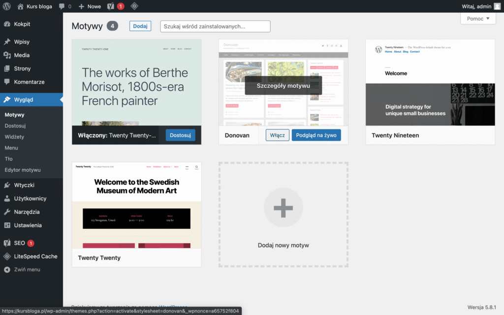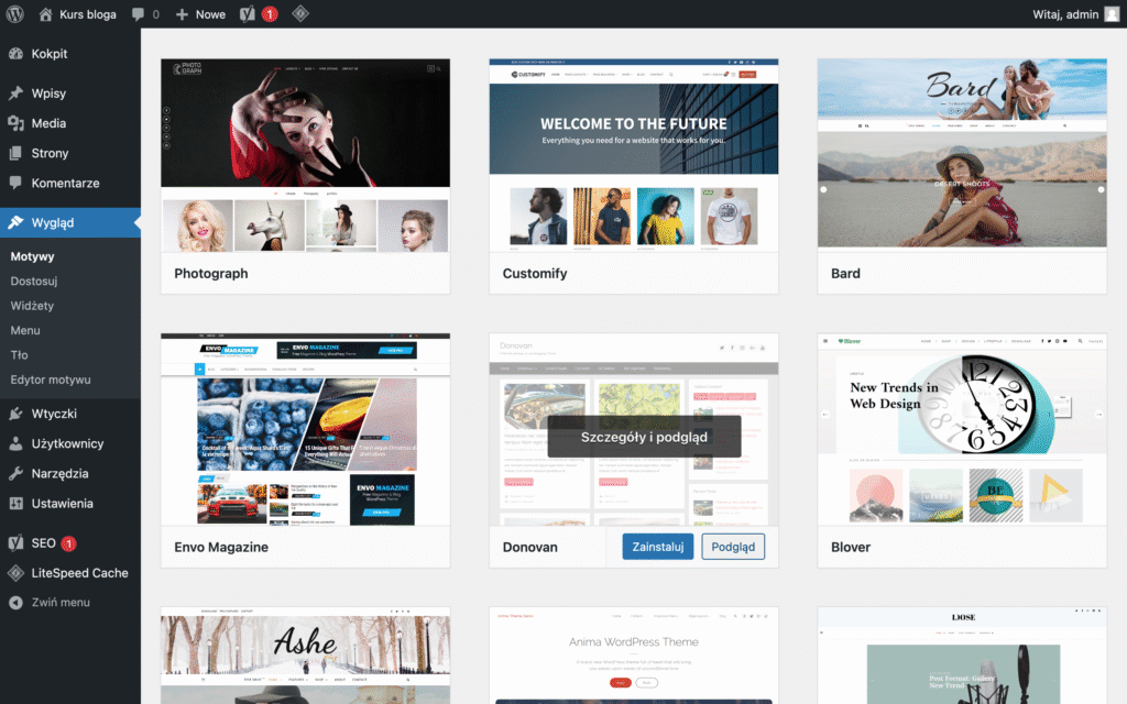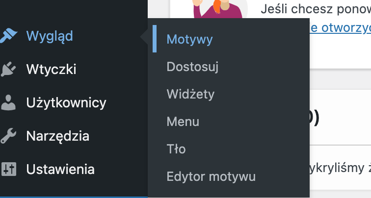 Wygląd bloga możesz łatwo zmieniać przy pomocy motywów. Znajdźmy coś fajnego. Wejdź w menu Wygląd a następnie Motywy.