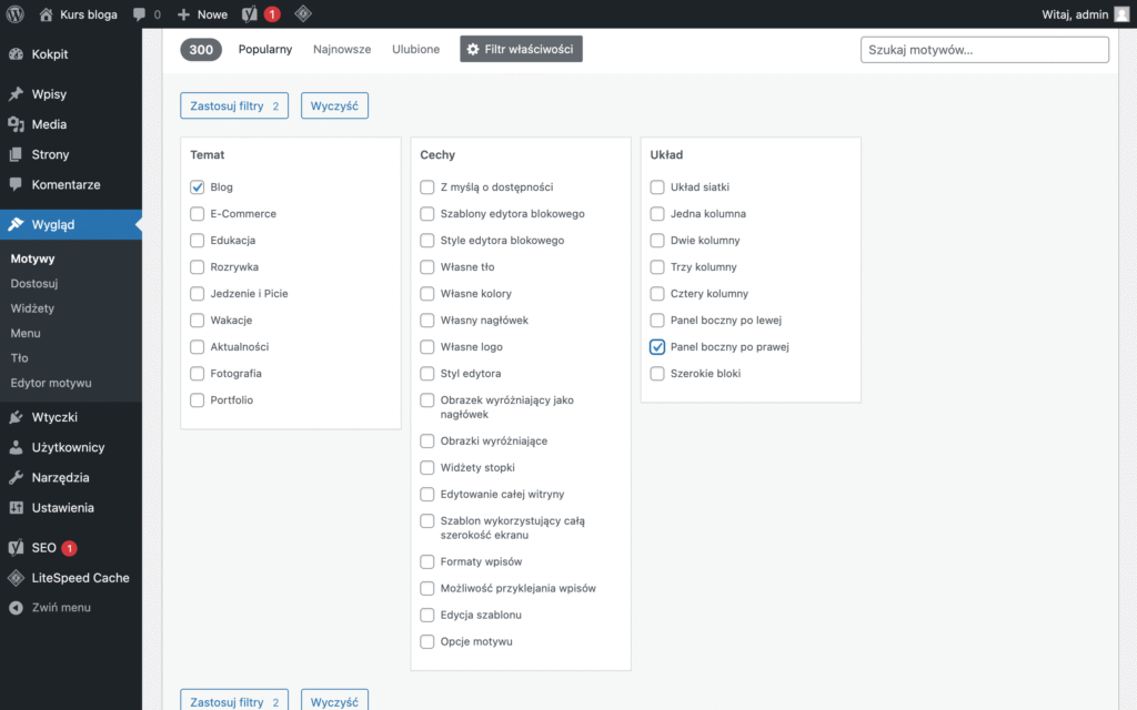 Pojawi się ekran z zainstalowanymi już motywami. Możemy do nich dograć nowy. W wyszukiwarce znajdziesz wiele darmowych motywów. Można też kupić w sieci bardziej zaawansowane za kilkadziesiąt dolarów. W menu dodaj motywy znajdziesz opcję Filtr właściwości. Możesz wybrać kilka opcji, które Cię interesują w wyglądzie. Ja wybrałem takie: