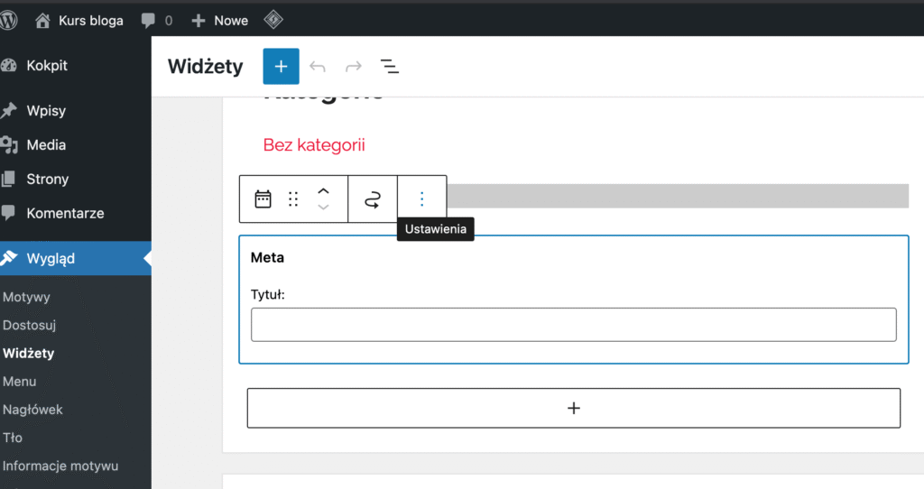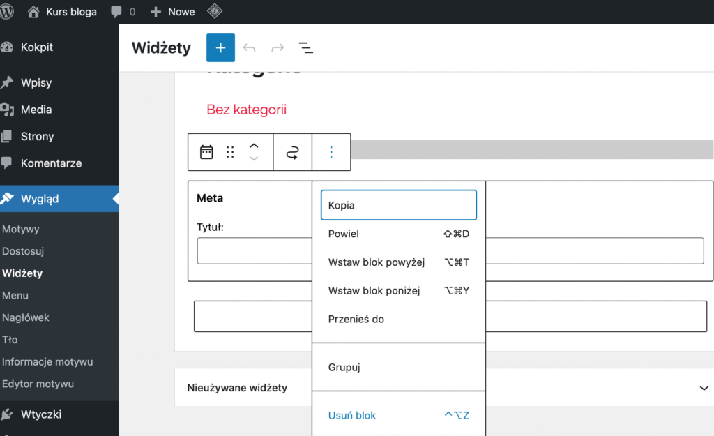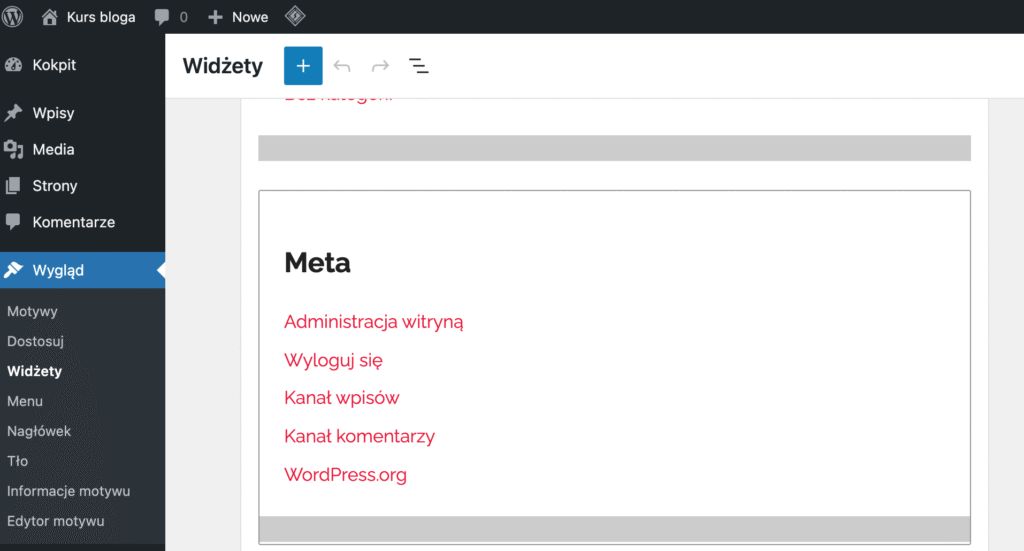Pojawi się lista aktualnie widocznych widżetów. Jeżeli prowadzimy blog samodzielnie – śmiało możemy usunąć widżet „Meta”.
