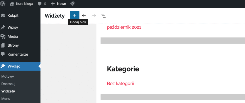 W podobny sposób możesz dodawać inne widżety. Na górze wybierz przycisk „Dodaj blok”. Eksperymentuj z nowymi widżetami.